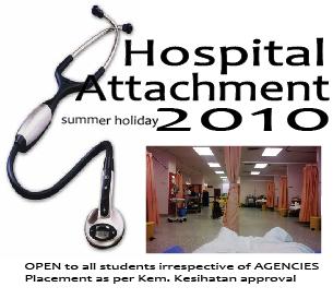 Atas permintaan ramai, usaha penempatan ‘ Hospital Attachment’ diteruskan. kepada yang berminat sila daftar disini. Borang rasmi akan diserahkan di Mesir pada awal May 2010 kepada yang mendaftar. Keputusan penempatan adalah hak mutlak KKM. Semoga program ini memberi pendedahan awal kepada mereka yang terlibat