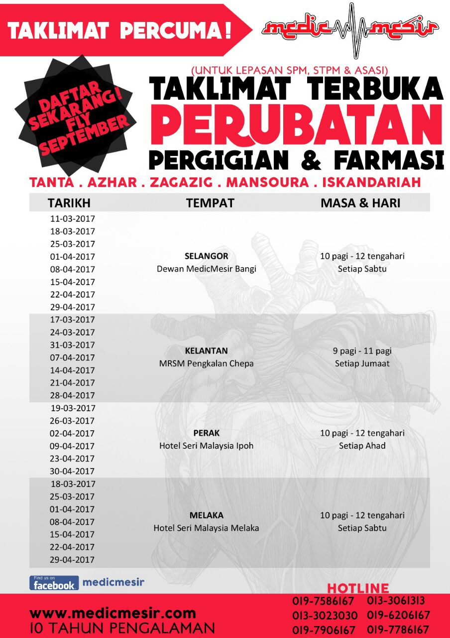 4. Alhamdulillah, atas permintaan ramai, seperti tahun2 lepas, khas untuk sesi pengambilan 2017, MM berbesar hati menjemput semua lepasan SPM / Matrikulasi / A Level / Asasi serta IbuBapa ke siri-siri taklimat yang akan diadakan diseluruh negeri bermula 11hb Mac 2017.
